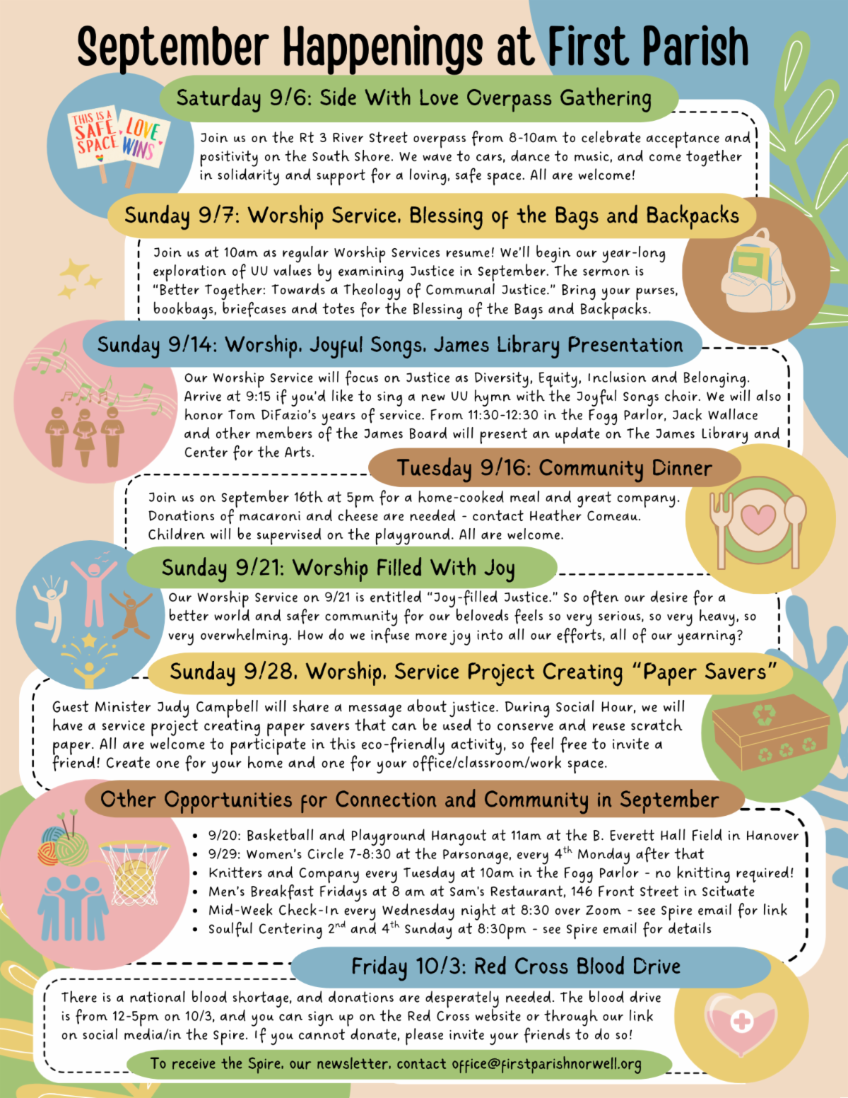 The Health and Wellness Action Team, an arm of the Fogg Outreach Committee, would welcome your interest during the church year 2025-2026. We are the group that plans health and wellness programming for the church such as the Pilgrim Belle all-church paddleboat cruise, the dementia and caregiver support group series, and the “In our Own Voice” “Peaceful Parenting” and “Suicide Awareness” programs.