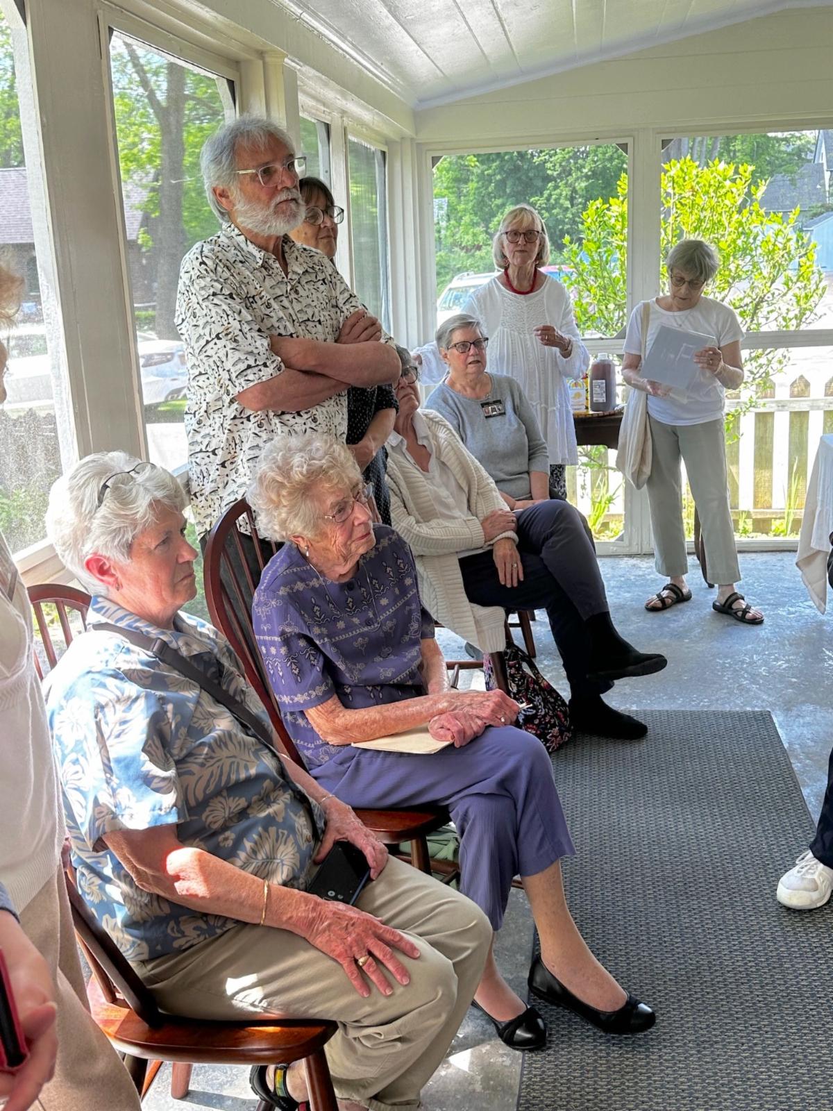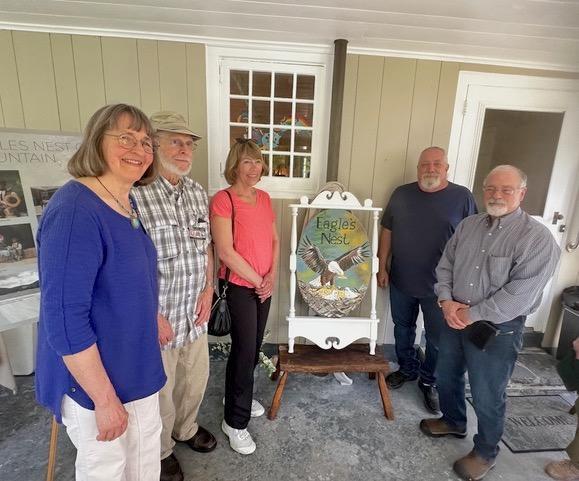 It was standing-room-only on the back porch of the museum on Sunday, May19th, for the unveiling of the newest artifact in the Eagle’s Nest exhibit. Through the creative efforts of Jim Lee, Wally Cook, and Cindy Gill Lapp, the museum now has on display a “reimagined” version of an old wooden sign that used to hang in front of a house up on Eagle’s Nest Road off Hurley Mountain Road. Jim replicated the frame and oval of the sign in his local woodworking shop, Wally turned the side spindles, and Cindy painted the image, adding her unique artistic touches. Just as with the tavern and trade signs of yesteryear, it took a team of expert artisans to complete the project. The Hurley Heritage Society is grateful to these three for donating their time and skill for this spectacular result. Also, a big thank you to our hospitality committee who laid out a table of delectable edibles for the event.