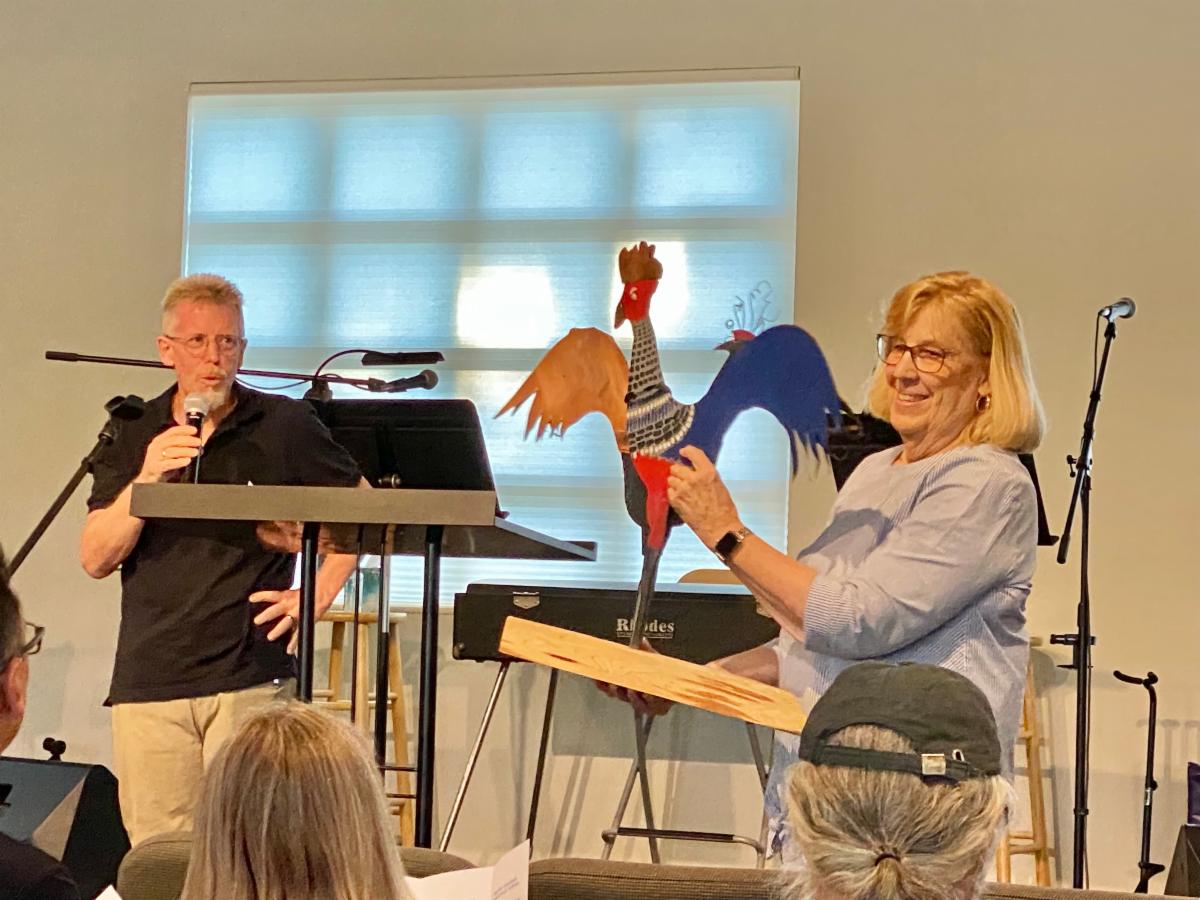 We recognized Bruce and Gail Whistance for their tireless efforts to our exhibits, by presenting them with a rooster, created by Cindy Gill Lapp. The title was Homer’s Hurley Hen, as a tribute to Winslow Homer. Gail and Bruce were instrumental in designing and researching our previous Winslow Homer exhibit.