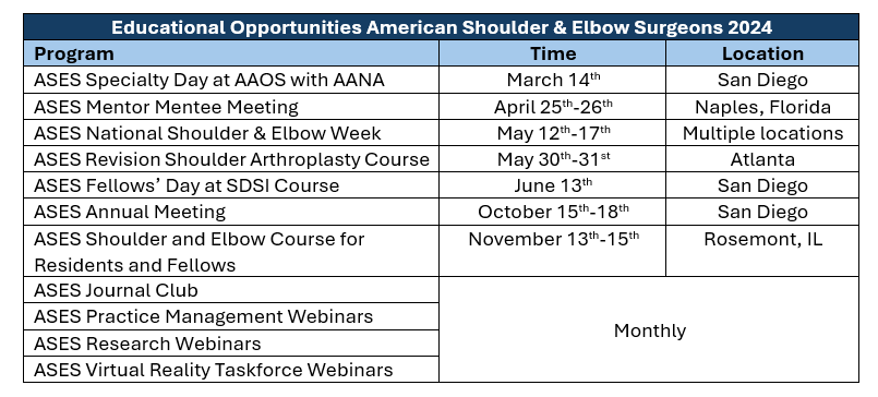 In this monthly message, I thought I would summarize educational opportunities that will be conducted in 2025 by American Shoulder & Elbow Surgeons, with many of you as participants (Faculty, attendees or contributors in other ways). As you will see, every month there is at least one face to face or online ASES program for the benefit of our members and other individuals interested in shoulder and elbow care. Hopefully this information will help you organize your time so that you can enjoy what ASES has to offer.