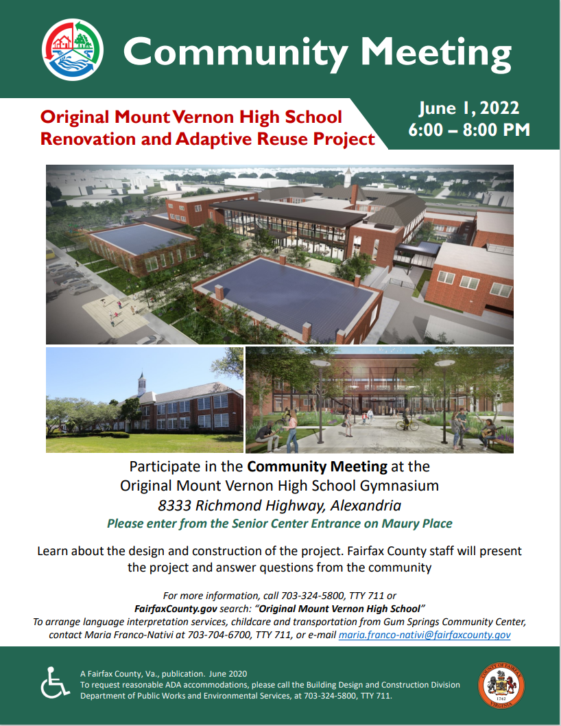 Reunión pública de Fairfax resiliente y comentario público ¡ESTA NOCHE! El martes 24 de mayo, únase al equipo responsable de la creación del primer plan de resiliencia y adaptación climática del condado de Fairfax para una reunión pública virtual. El equipo de Resilient Fairfax se reunirá con los residentes del condado a las 6:30 p.m. para discutir los hallazgos y recomendaciones del plan, responder preguntas en tiempo real y revisar cómo los residentes pueden ofrecer comentarios sobre el plan. Obtenga más información y regístrese en línea... Richmond Highway BRT y Turn Lane Aporte de la comunidad Recientemente, el Departamento de Transporte del Condado de Fairfax (FCDOT) invita al público a realizar una encuesta sobre los carriles de giro, para compartir su opinión sobre las recomendaciones del personal relacionadas con posibles cambios. Aprende más... Estudio de viabilidad de gestión de riesgos de tormentas costeras (CSRM) El Cuerpo de Ingenieros del Ejército de EE. UU. y el Consejo de Gobiernos del Área Metropolitana de Washington están trabajando juntos en el Estudio de viabilidad de gestión de riesgos de tormentas costeras (CSRM, por sus siglas en inglés) del Distrito Metropolitano de Washington de Columbia. El propósito del estudio es investigar las inundaciones costeras en el norte de Virginia y evaluar las posibles medidas para reducir el riesgo de inundaciones costeras para las poblaciones, propiedades, infraestructura y recursos vulnerables para apoyar a las comunidades resilientes. El estudio incluye medidas de mitigación de inundaciones para la cuenca de Belle Haven. Ese proyecto se está considerando como parte del estudio para un diseño posterior. El Borrador del Informe Integrado de Factibilidad y Evaluación Ambiental para el estudio se publicará para revisión pública el 27 de mayo de 2022. El informe estará disponible en línea en el sitio web del proyecto durante un período de revisión de 30 días. Se llevará a cabo una reunión pública el martes 14 de junio de 6 a 8 pm en la cafetería de la Escuela Primaria Belle View (6701 Fort Hunt Road). Los comentarios públicos serán compilados, compartidos y evaluados por todo el equipo de USACE. Los comentarios y sugerencias de los residentes son muy valiosos y son una parte integral del proceso. Los niños de 5 a 11 años ahora son elegibles para un refuerzo de vacunas de Pfizer-BioNTech La Administración de Drogas y Alimentos de EE. UU. (FDA) se reunió el 17 de mayo y modificó la autorización de uso de emergencia (EUA) para la vacuna Pfizer COVID-19, autorizando el uso de un solo refuerzo para niños de 5 a 11 años de edad, al menos cinco meses después de completar una serie primaria con la vacuna de Pfizer. Aprende más... |