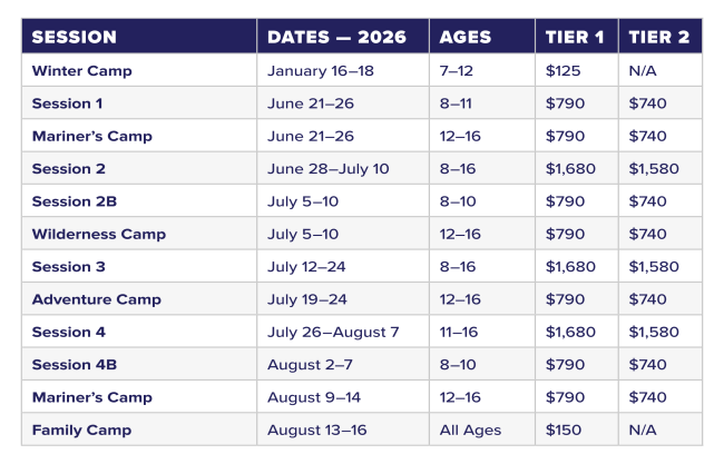 Choose Tier 1 to give back to our beloved Chanco, or choose Tier 2 for a subsidized cost — no matter your choice, your camper will receive the same incredible experience!