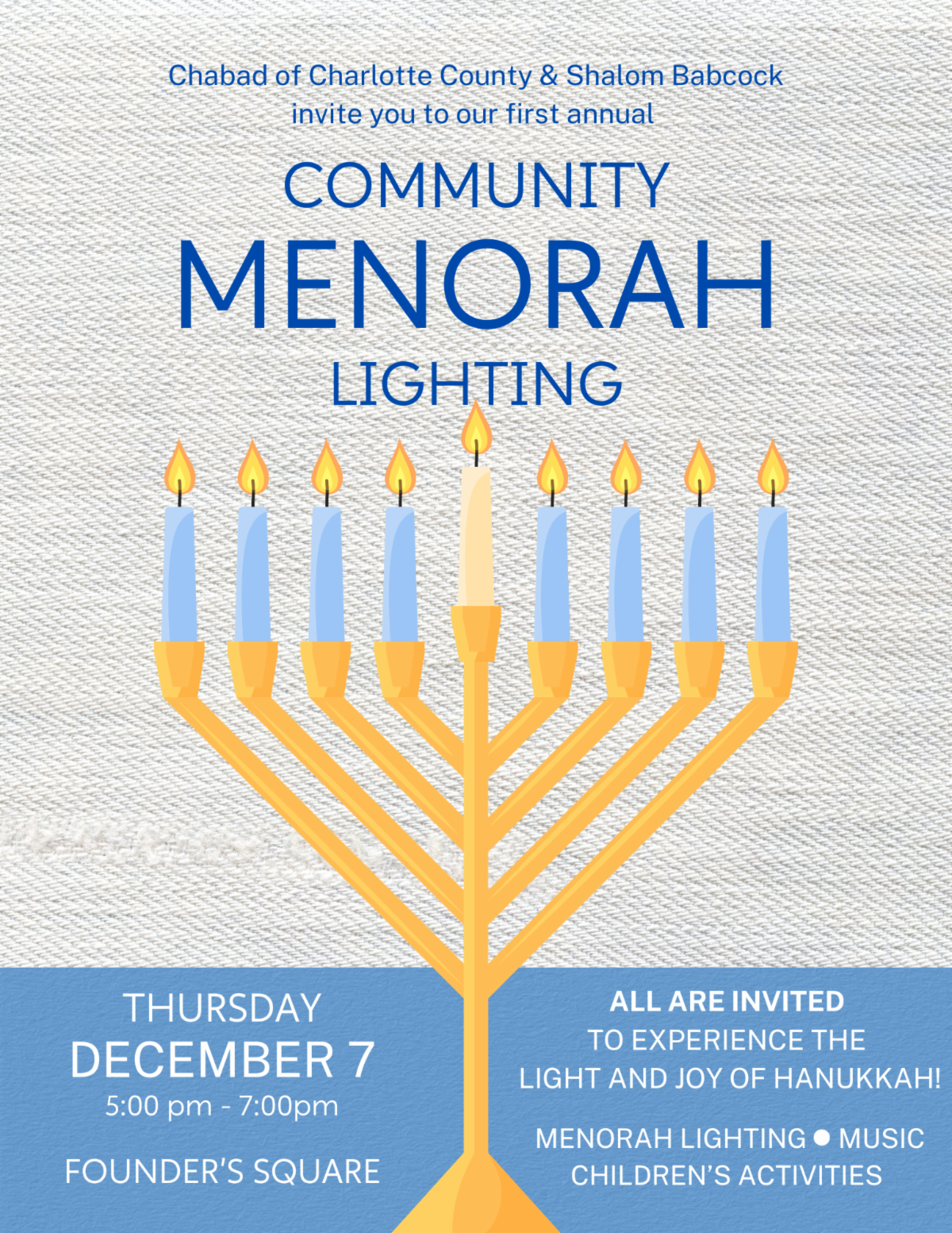 | | Babcock Ranch Holiday Market Today | | Babcock Ranch Holiday Market, 9:00 a.m., Founder’s Square | | Shop small and join us for the Babcock Ranch Holiday Market today from 9:00 a.m. - 3:00 p.m. at Founder's Square. You can browse and shop from a curated selection of over 30 local small businesses. Discover unique finds to elevate your holiday gift-giving. | | Community Menorah Lighting | | Community Menorah Lighting, Thursday, December 7th 5:00 p.m.-7:00 p.m., Founder’s Square | | Join the Chabad of Charlotte County & Shalom Babcock on December 7th in Founder's Square for their first annual Community Menorah Lighting. All are invited to experience the light and joy of Hanukkah! | | Farmers Market at the Fieldhouse this Sunday | | Farmers Market, Sunday, November 26th 9:00 a.m.-1:00 p.m. Fieldhouse | | Please take note that the Farmers Market will be held at the Fieldhouse this Sunday. | | Jingle Ball 5k, 8:00 a.m. - 10:00 a.m., Founder’s Square | |