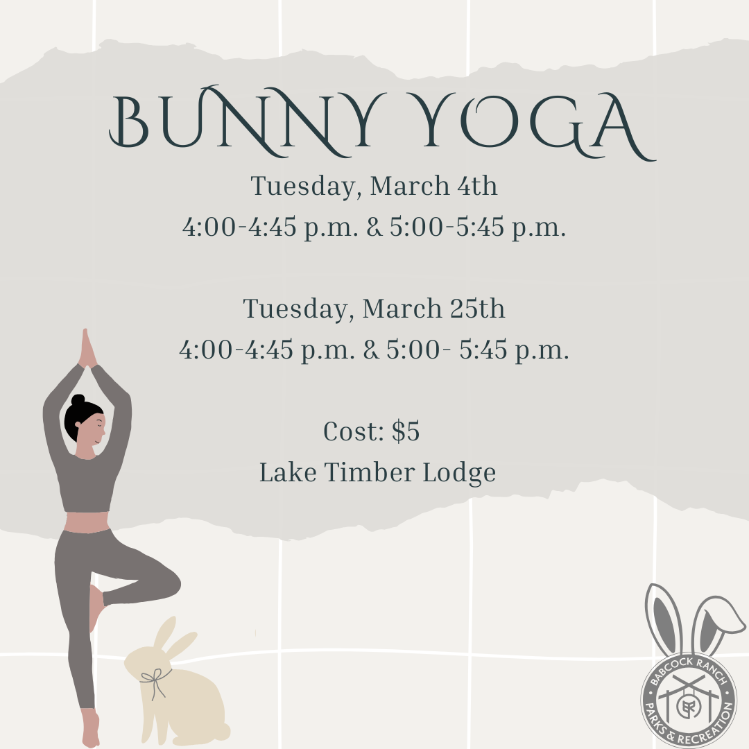 Parks and Recreation is offering a fun-five-dollar, bunny yoga class for all ages! Classes are limited to 25 and there will be 2 classes available. Please be sure to register as they will fill up!