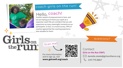 Another season of empowerment is here, and we’re hoping you’ll share your spark as a superstar coach! Whether you’re new to Girls on the Run or returning, we’re confident you’ll experience as many meaningful moments as our participants. In fact, 99% of coaches in a recent survey agreed that the experience was valuable and rewarding. We’re looking for dedicated individuals, 18+ to coach and 16-18 to be junior coaches, to lead teams of 8-15 girls twice a week. Volunteers must be willing to submit a background check. Sign up today to make a positive impact on local girls and help guide them on their journey toward confidence and success! Apply at www.gotrlswfl.org or contact Danielle at danielle.steele@girlsontherun.org for more details.