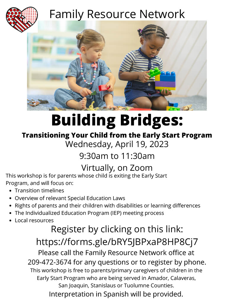 | | Is your child turning 3 soon? Join Family Resource Network for a parent workshop on Building Bridges: Transitioning Your Child From the Early Start Program! Learn about the process of advocacy, what's happening during the months leading up to your child's 3rd birthday, the Individual Education Plan (IEP) process, and ongoing services available through VMRC. You will walk away from this training with knowledge that will give you a great foundation for the next stage of parenting your child with special needs. Attendees will receive a Building Bridges workbook to complete to prepare for your child's transition. Spanish interpretation will be available upon request. This training is on Wednesday, April 19, 2023, virtually on Zoom. Register by clicking the link on the flyer, calling the FRN office at 209-472-3674 or by email at FRNfamilies@frcn.org | | | | |