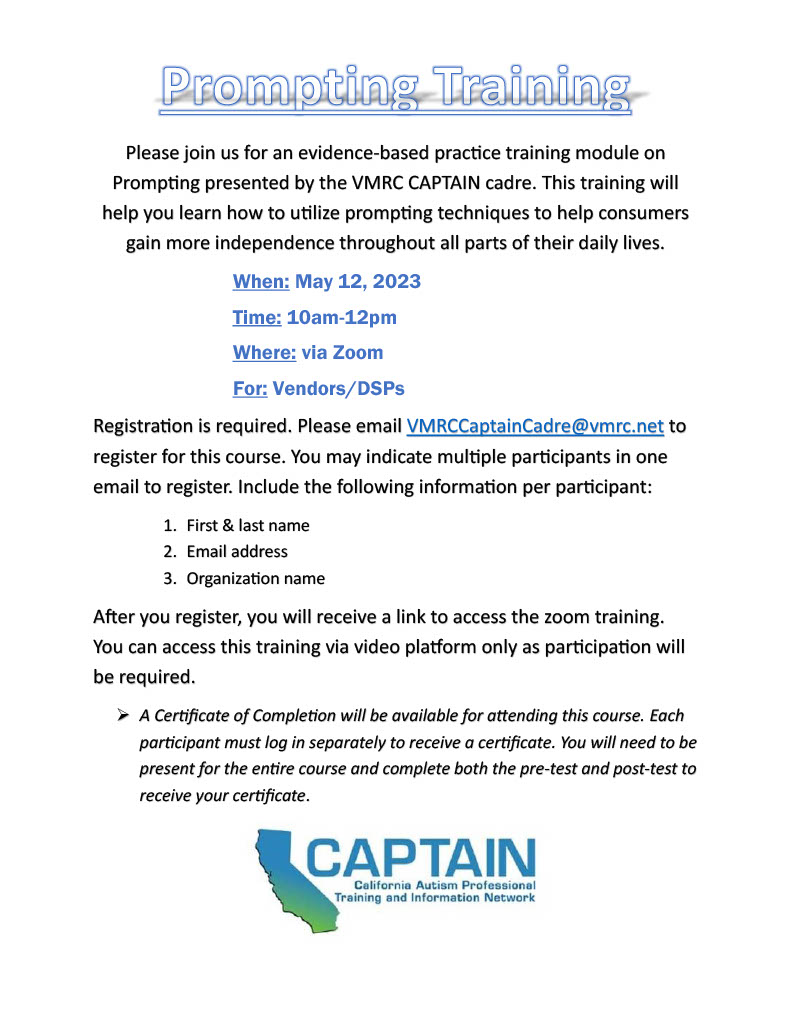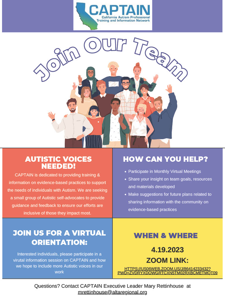 | | The California Autism Professional Training and Information Network (CAPTAIN) is looking for Autistic adults to share their unique perspectives to better inform the work we do. CAPTAIN is a multi-agency network dedicated to sharing information about evidence-based practices to support the needs of individuals with Autism. If you or someone you know would be interested in joining our team, please see the attached flyer and join us for a virtual recruitment event on April 19th, 2023 at 10am. The link to attend this event is located on the flyer. | | |