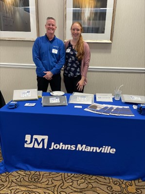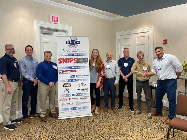 Diamond Sponsor Snips News editor, Austin Keating shaking hands with SPIDA president Brennan Hall. Gold Sponsors Johns Manville (center) and Ductmate Industries (left).