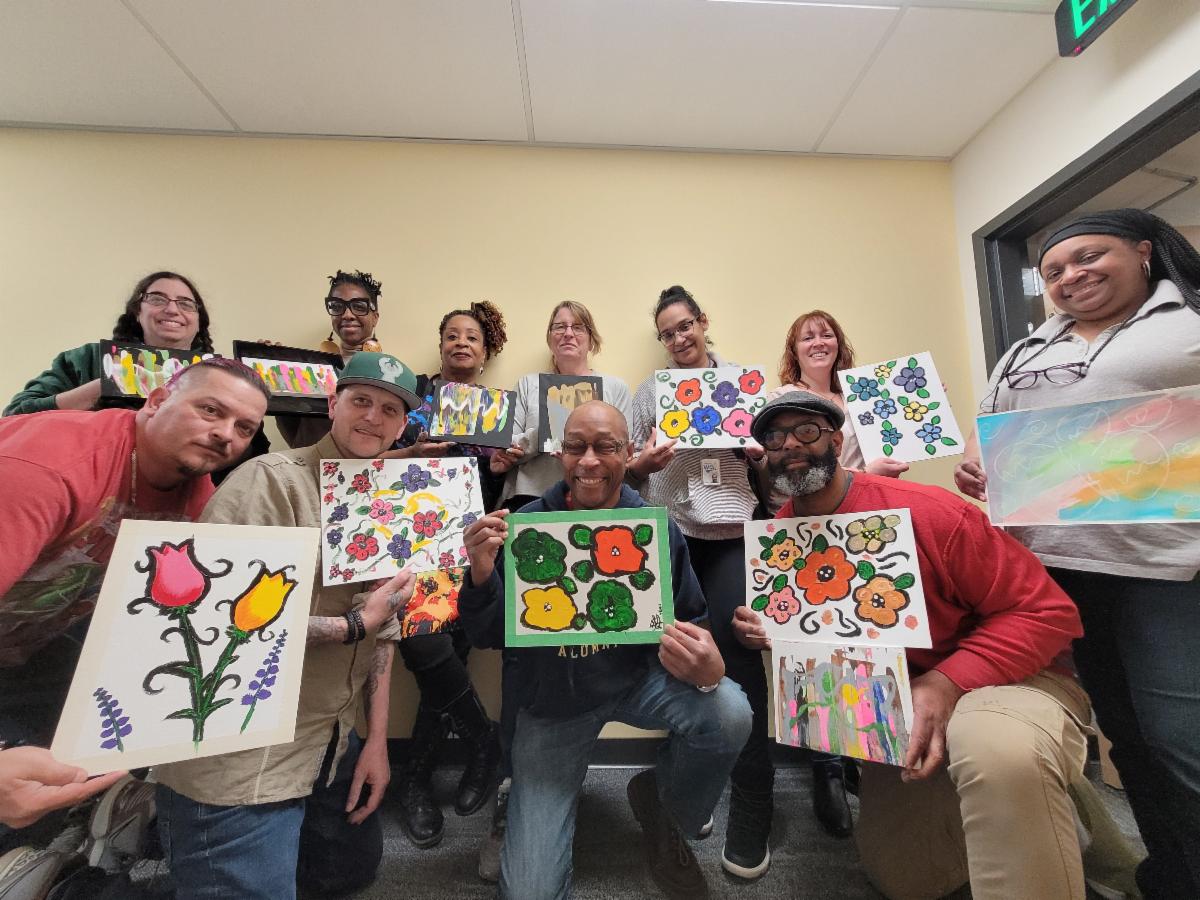 WCS employees participated in an art workshop that cultivated camaraderie, creativity, and confidence in their individual abilities. Human Resources Coordinator Melva Darrough, who is also a visual artist and led a similar class in 2022, offered instruction to the 10 employees who came to the April 1 workshop at the WCS Wisconsin Avenue Campus building. In just two hours, the employees created crayon resist art, abstract flowers, and squeegee art. Darrough taught with a calming voice accompanied by smooth jazz music, which she says helps create an atmosphere supportive of self-expression and relaxation. In addition to learning how to create these forms of art, participants also realized how practicing art can be a form of self-care because it has the ability to help improve mental health.