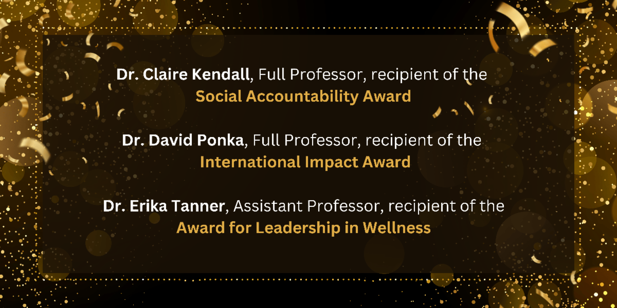 | | Our faculty award winners were presented their awards by the Dean, Bernard Jasmin. | | (L-R): Dr. Claire Kendall, Dr. David Ponka, and Dr. Erika Tanner accepting their awards | | Members of our DFM faculty leadership team and administrative staff attended the Faculty of Medicine Gala in November to celebrate our award winners. | | (L-R): Ryan Morrison, Andrea Rawley, Dr. Eric Wooltorton, Dr. Claire Kendall, Dr. Lindsay Bradley (spouse-L), Dr. David Ponka (spouse-L), Dr. Denice Lewis, Roslyn Ahrens, Dr. Doug Archibald, (spouse-R), Dr. Erika Tanner (spouse-R) | | | | Congratulations to Dr. Kay-Anne Haykal, Associate Professor, who received the Undergraduate Medical Education, Health Advocate Competency Award. This Scholarship Award is presented to a faculty member who displays an exceptional degree of compassion towards patients within the Francophone Stream. | | |