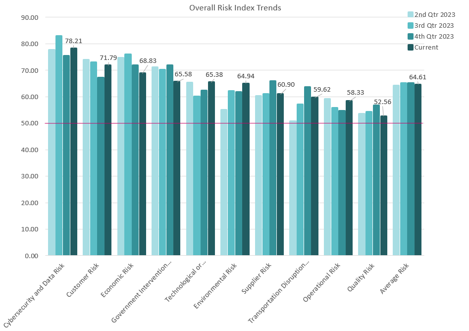 Cybersecurity is again the highest risk overall at 78.34, with a slight increase from last quarter. Customer Risk has jumped to 2nd overall, suggesting that it has become increasingly harder to predict customer demand and customer loyalty. Interestingly, Technological Risk has become a top 5 risk for the first time, suggesting there is concern about disruptive and replacement technology going forward. |