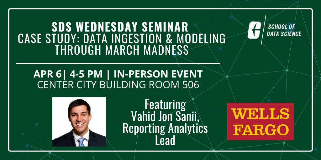 Please Encourage Students to Participate. Each semester the SDS hosts regular professional development seminars on Wednesday afternoon. These sessions allow students to interact directly with companies and thought leaders across multiple domains in data science and analytics. The April 6th Wednesday Seminar will feature Vahid Sanii, Reporting Analytics Lead, Wells Fargo. He will walk students through the process of data munging through analysis, Case Study: Data Ingestion & Modeling through March Madness. This session will be in-person, held on the Center City campus/Dubois Center. |
