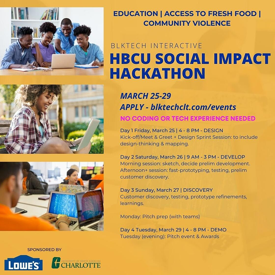 BlkTech Interactive is hosting the HBCU Social Impact Hackathon built by Lowes on March 25 - 29. HBCU teams of current students and general community members will design and develop innovative tech solutions to address the challenges of access to fresh food, education, or community violence. The event will be held at UNC-Charlotte and virtually for the opportunity to win $5,000, be highlighted in the national media, mentored to submit for larger challenges that include the $200,0000 MIT Youth Challenge and the $150,000 Tech Stars Social Impact Challenge, and increase social capital with access to internships and employment with Lowes Home Improvement and other corporate partners. |