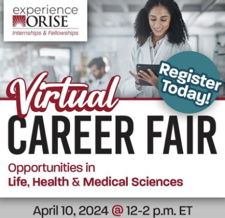 | | Wednesday SDS Seminars- 4:00-5:00 pm | | Experience ORISE Virtual Career Fair: Opportunities in Life, Health & Medical Sciences, April 10, 2024 | 12 p.m. to 2 p.m. ET | | Other Newsletters and Resources | | |