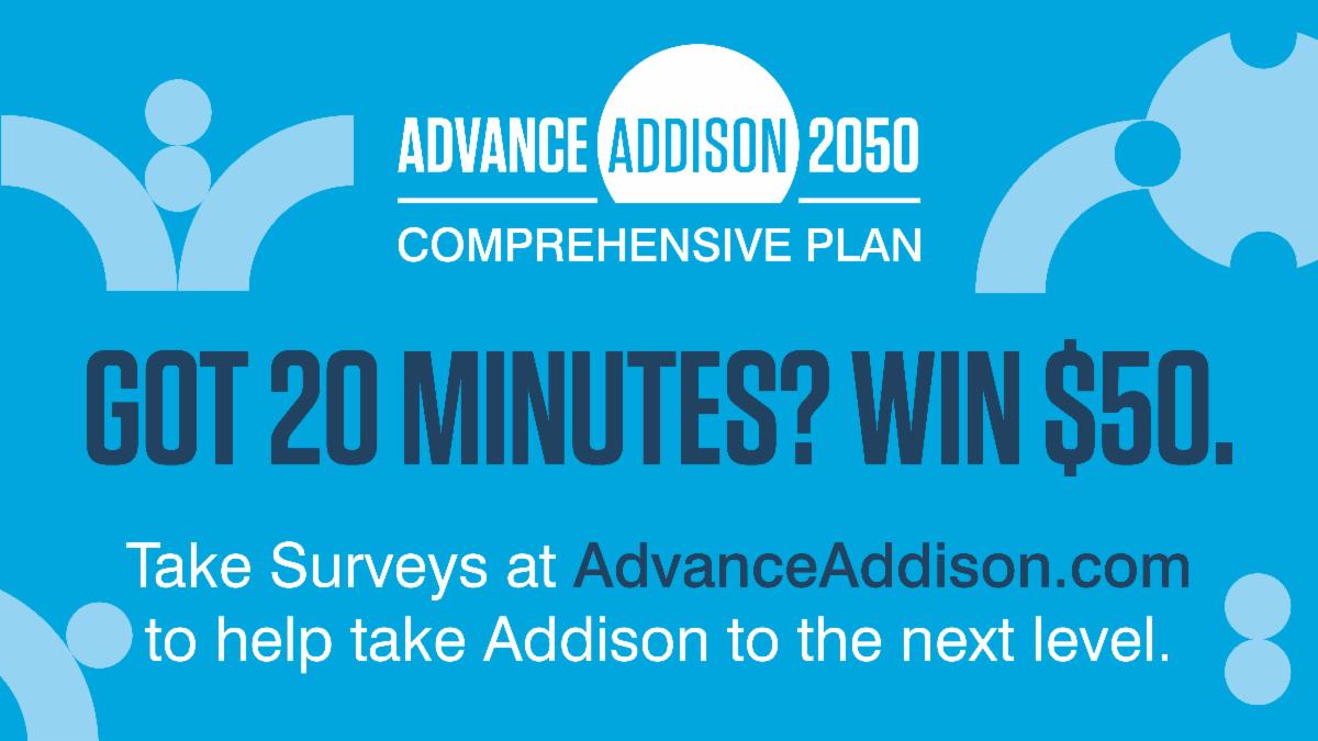 If you haven’t completed the most recent Advance Addison survey yet, you can still fill it out online through January 31, 2024, and be entered for a chance to win a $50 gift card to an Addison business.