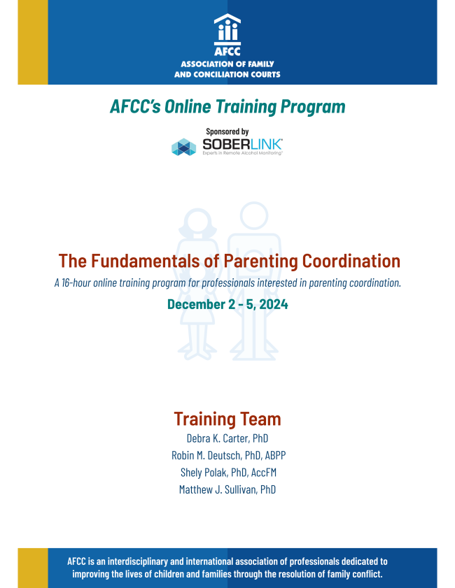 Interested in parenting coordination? Join AFCC in December for a program that will provide a comprehensive overview of the parenting coordination process, including definition of the role, responsibilities, and function of the parenting coordinator; an overview of family dynamics; specific PC strategies, techniques, and interventions; implications of intimate partner violence; cultural considerations; ethical issues; and use of technology.