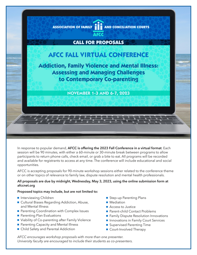 In response to popular demand, AFCC is offering the 2023 Fall Conference in a virtual format. If you'd like to present at an AFCC conference from the comfort of your home or office, we are accepting proposals for 90-minute workshop sessions. See the Call for Proposals for complete instructions. Proposals must be submitted using the online form by the deadline on Wednesday, May 3, 2023 by midnight (Pacific).