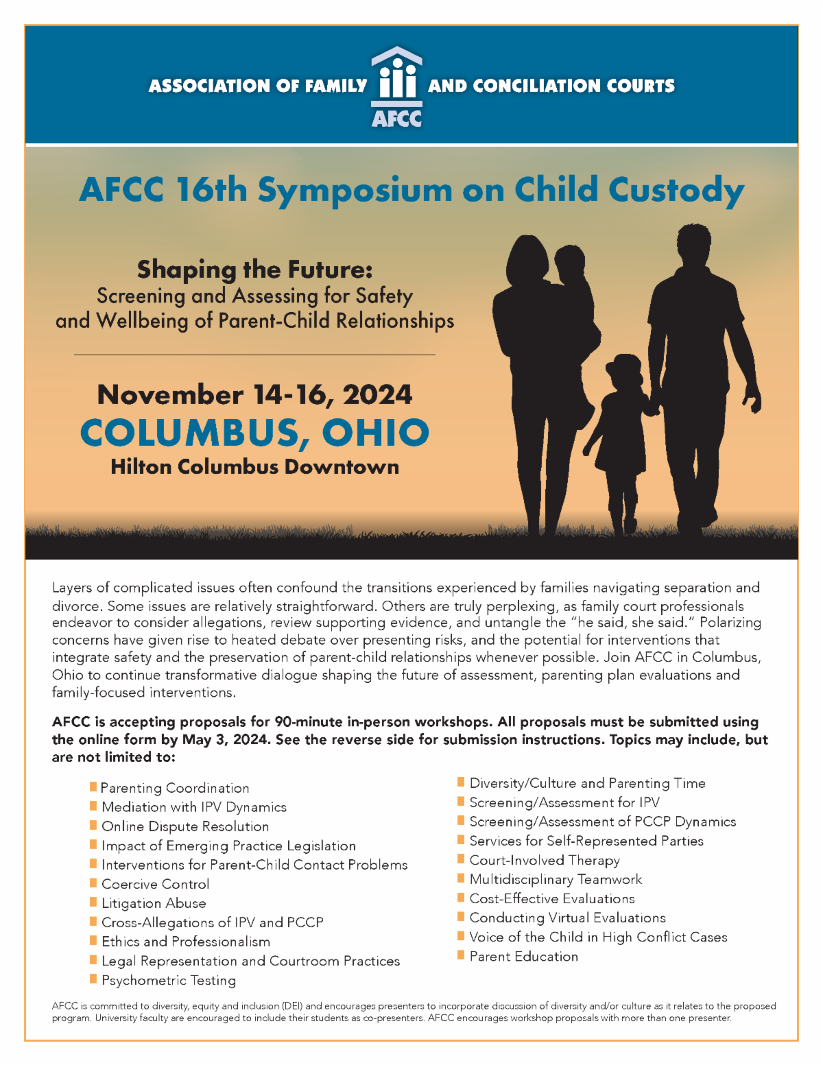 AFCC is accepting proposals for 90-minute workshops for our 16th Symposium on Child Custody. The deadline to submit a proposal is May 3, 2024.