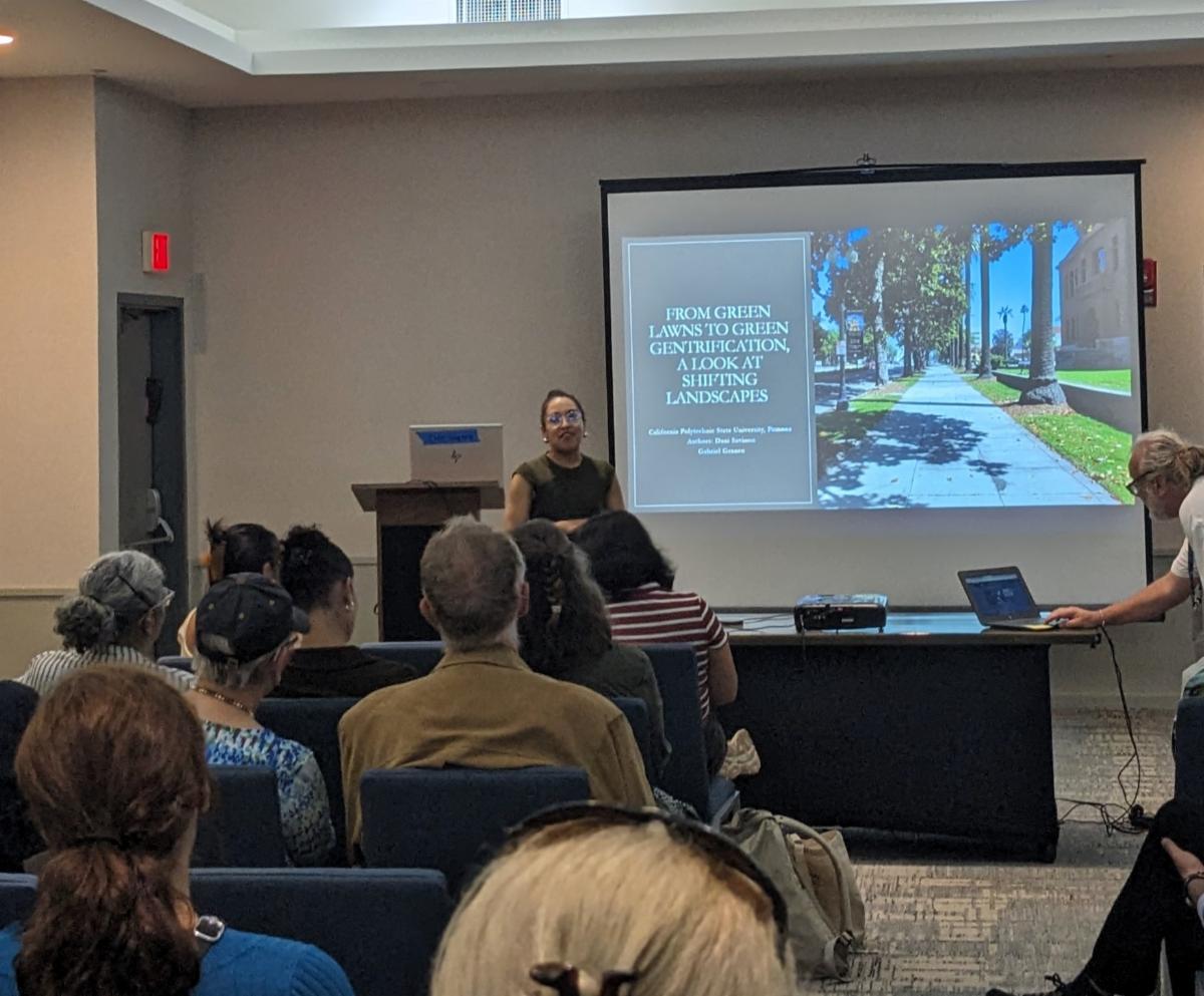 Dani Savinon, a Geography Major, won the prestigious President’s Paper Award at the Undergraduate level at the Association of Pacific Coast Geographers Conference! Her groundbreaking paper, “From Green Lawns to Green Gentrification, A Look at Shifting Landscapes,” offers a fresh perspective on the interplay between plant integration in new developments and green gentrification in Santa Ana, CA. Savinon is advised by Dr. Gabriel Granco in the Department of Geography and Anthropology.