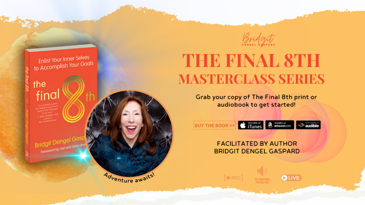 Join me in this powerful live-streamed 2-hour introduction to The Final 8th Masterclass Series and receive your own complementary, signed copy of my new book The Final 8th: Enlist Your Inner Selves to Accomplish Your Goals as I introduce the Final 8th process combined with an innovative technique developed by my mentors, Drs. Hal and Sidra Stone called Voice Dialogue.