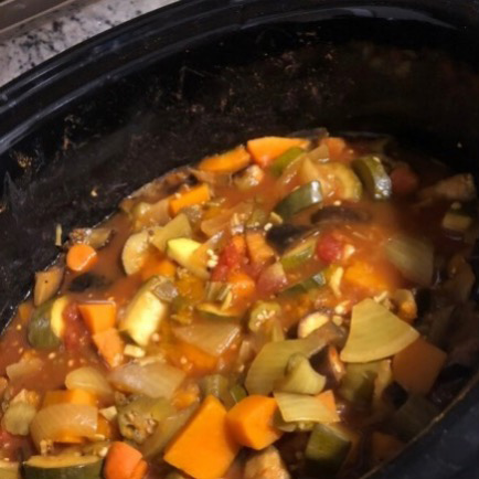 | Directions In a slow cooker, combine butternut squash, eggplant, zucchini, okra, tomato sauce, onion, tomato, carrot, broth, raisins, and garlic. Season with cumin, turmeric, red pepper, cinnamon, and paprika. Cover and cook on low for 8 to 10 hours, or until vegetables are tender. Enjoy! |