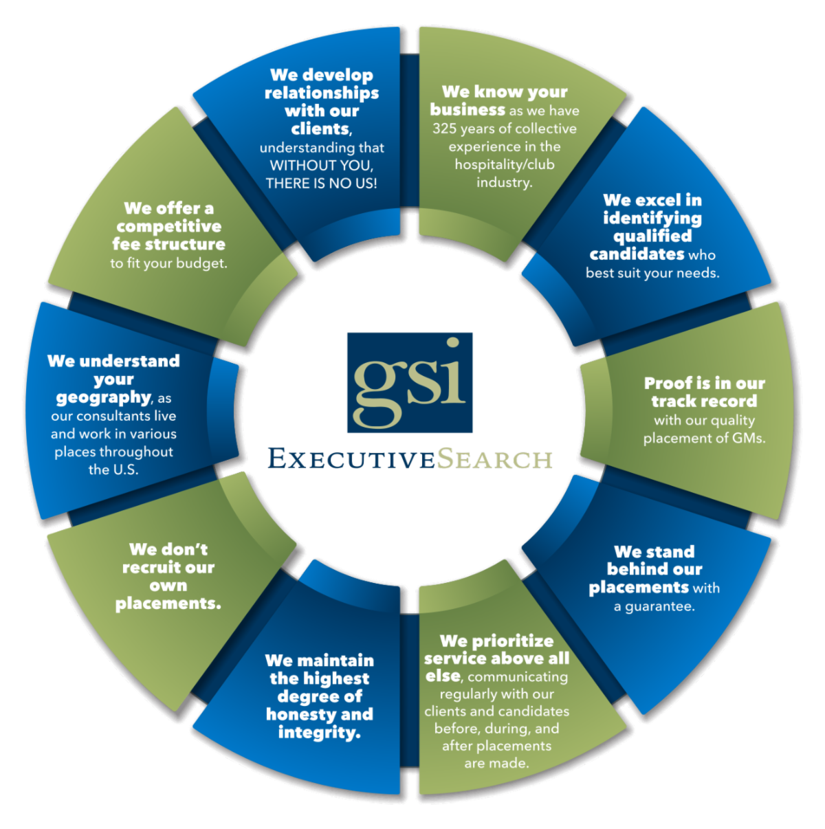 GSI Executive Search, an Ethos Club & Leisure Alliance company, is a full-service executive search firm serving the private club and hospitality industries throughout the U.S. The firm's hands-on, thorough, and results-oriented approach has led to successful placements for over 25+ years with more than 500 client clubs/organizations and over 900 search assignments.