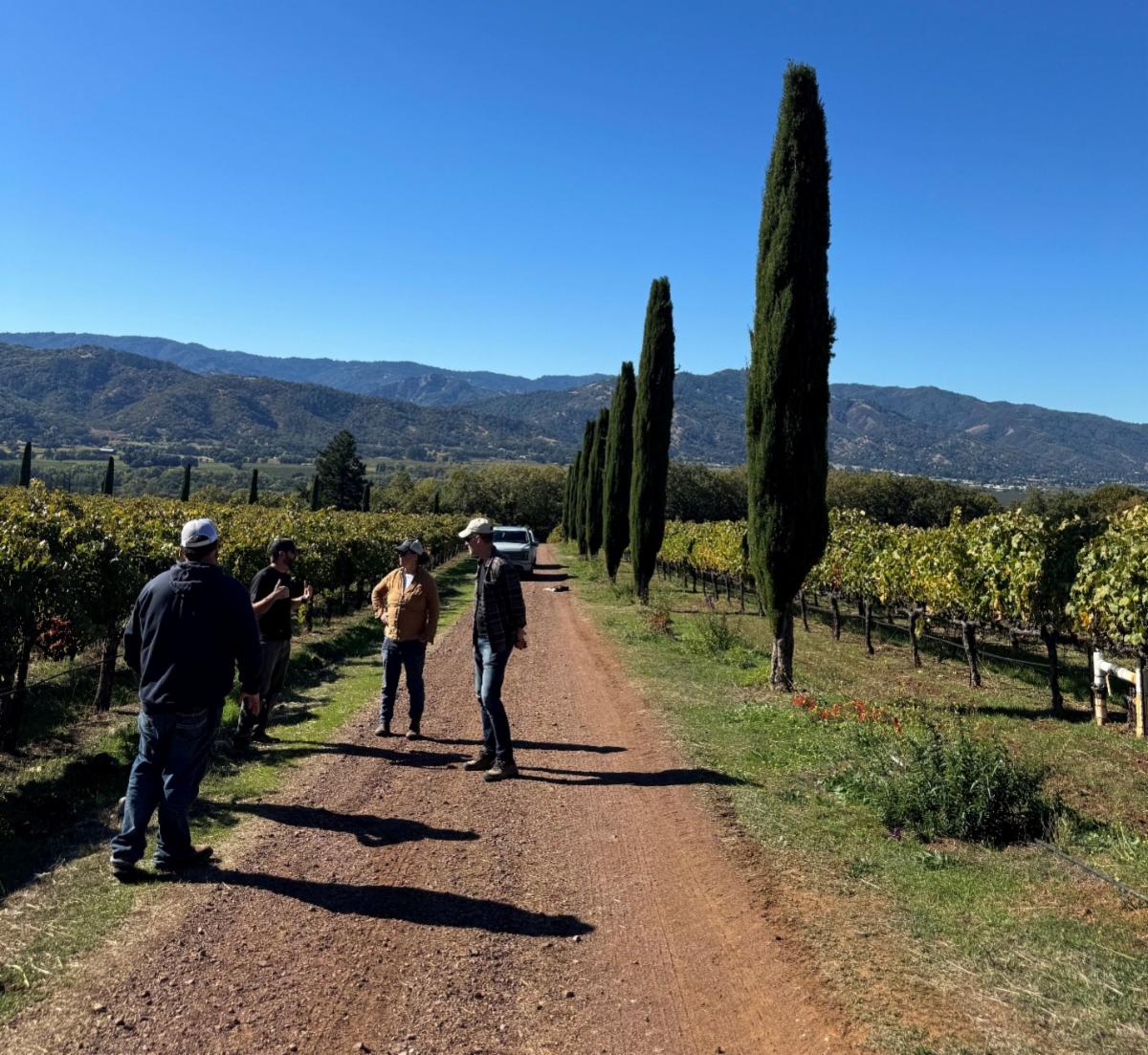 October 2025: The MCRCD Soil Team visiting Dark Horse Vineyards with Kurt Malchow from Wildlife Conservation Board to look at hedgerows planted late this spring |