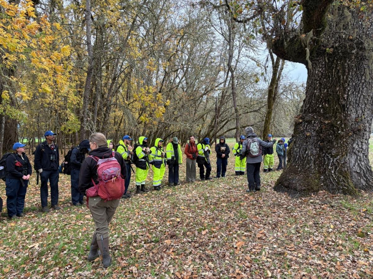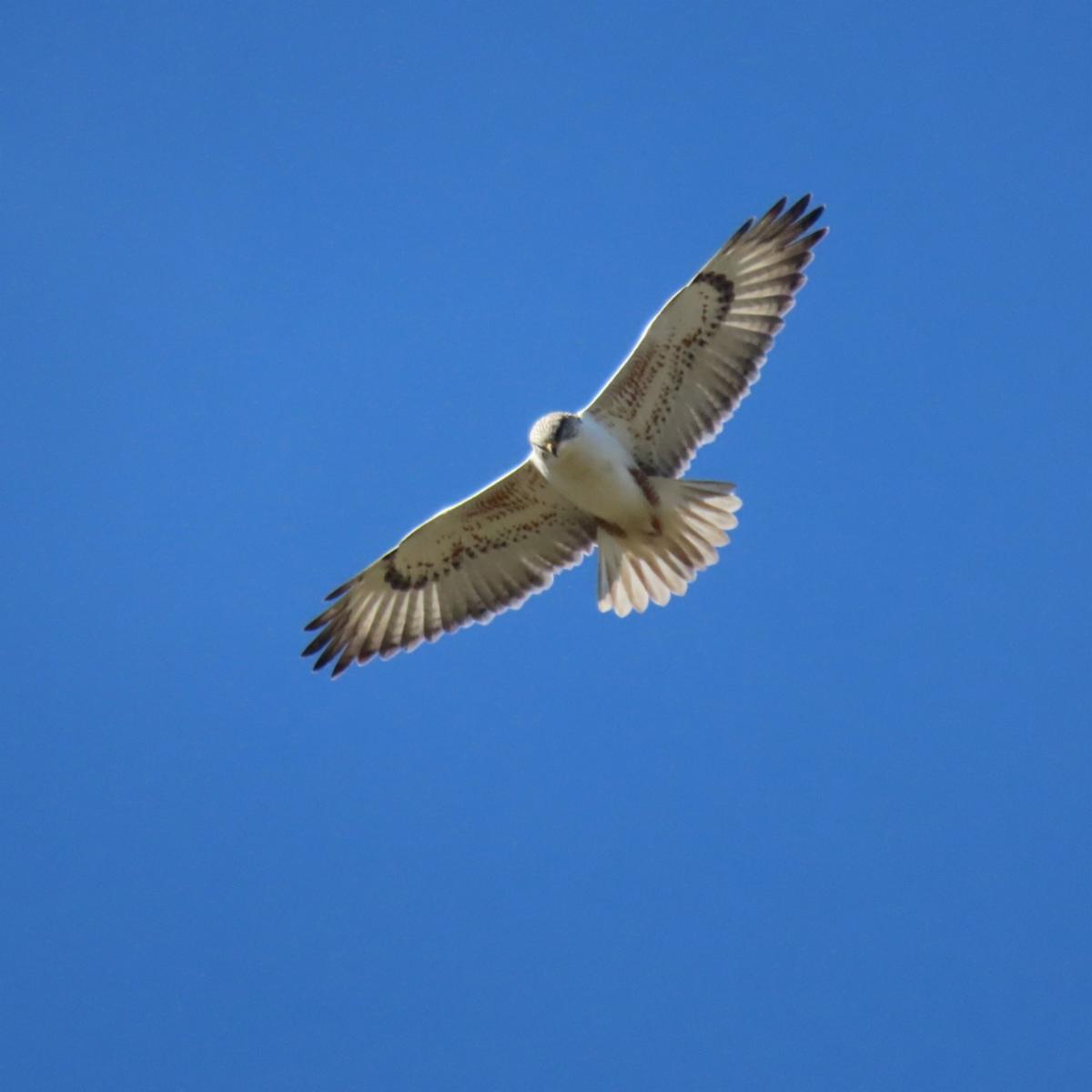 | | November 2025: MCRCD project staff hosting California Conservation Core students, three Grizzly Core Staff, and Jen Riddell and Hannah Bird, representing the Hopland Research and Extension Center, out on the project. | | | The Mitigation Project welcomed 26 students from the new California Conservation Corp (CCC) facility that just opened south of Willits as part of California Naturalist Classes taught and organized by Jennifer Riddell, a former Board Member of the MCRCD. Mitigation project staff participated in the class and talked to the students about the birds of the oak woodland community, the creation of the wetlands, endangered North Coast Semaphore grass, managing invasive species, and trapping feral pigs. The group was treated to the sight of one of our beautiful wintering raptors, a Ferruginous Hawk, and many other raptors and birds. | | | November 2025: Ferruginous Hawk over the Mitigation Project. | | |