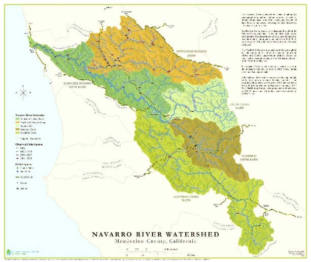 | | | | Climate Resilience in the Navarro Watershed | | In January 2025 the MCRCD, along with partners at The Nature Conservancy and Trout Unlimited, were awarded $2.7 million grant from the Wildlife Conservation Board for the Navarro-Mill Creek Streamflow Enhancement Implementation Project. The Project consists of five streamflow enhancement projects: repairing an incised channel, developing a pond release plan, installing large wood, constructing an infiltration basin, and implementing a storage and forbearance project in Mill Creek tributary to the Navarro. These projects will improve streamflow and provide critical habitat for fish and wildlife, increase water supply reliability for landowners, and demonstrate groundwater infiltration strategies. Below are images of the 56,000-gallon off-stream storage tank on the left and a 2,400 sq. ft. infiltration basin on the right. | | Additionally, in May of 2025 MCRCD was awarded $1.14 million through the California Department of Fish and Wildlife through the Cannabis Restoration Grants Program working with Mainspring Consulting and Stillwater Sciences to complete stream restoration planning along a section of Denmark Creek and improve agricultural and land management practices in order to protect upland and stream habitat from future land use impacts. | | MCRCD staff edited and updated a second edition of the Navarro River Guide to Watershed Care and Restoration, with an updated map of the watershed created by Jessica Reid. | | Link to the River Guide here | | | |