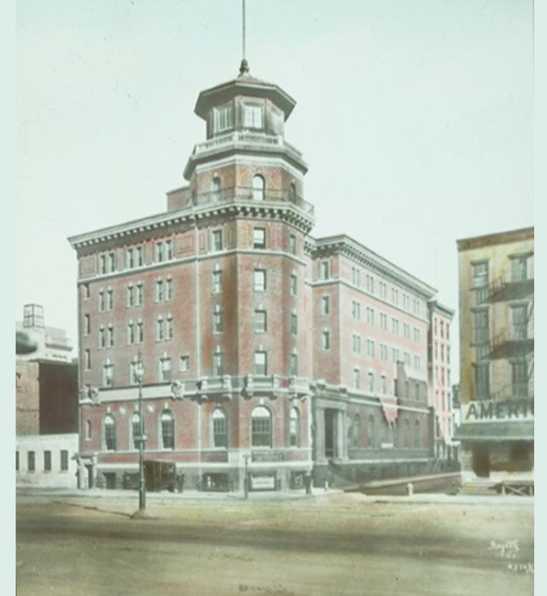 In 1912, SCI memorialized the Titanic with a lighthouse atop our Seafarers’ Hotel at 25 South Street, then under construction. We provided clothing for the surviving Titanic crew. Those seafarers were housed at the nearby American Seamen’s Friend Society Hotel on Jane Street—just opposite Pier 54, where Carpathia had docked. That very building lives on today as the Jane Hotel, seen here in a digitized lantern slide from SCI’s collections. SCI later held a service for survivors at our North River Station at Houston Street, near Pier 40.
