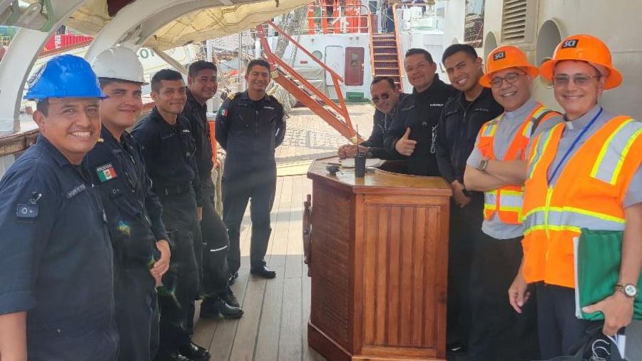 | | SCI Chaplains coordinated to have members of Stella Maris (pictured on the far right) visit the ARM Cuauhtémoc, providing support to the crew members aboard the vessel. | | |