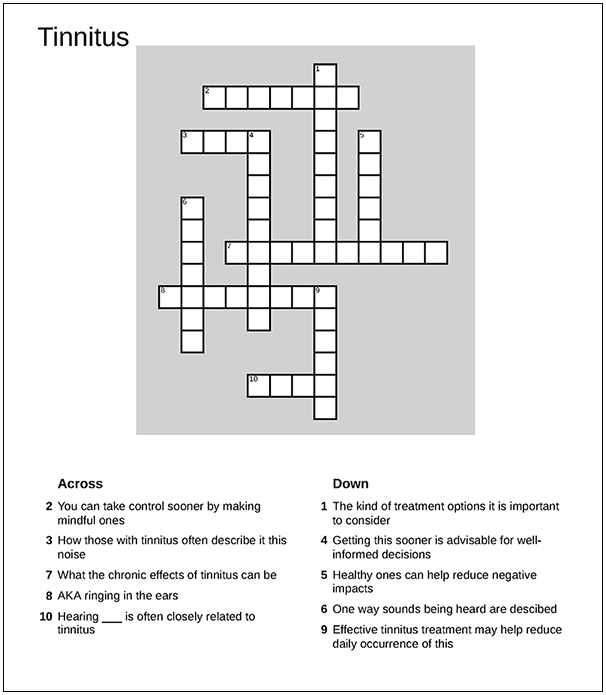 8 Noble W, Tyler R. Physiology and phenomenology of tinnitus: implications for treatment. Int J Audiol. 2007;46(10):569-575.