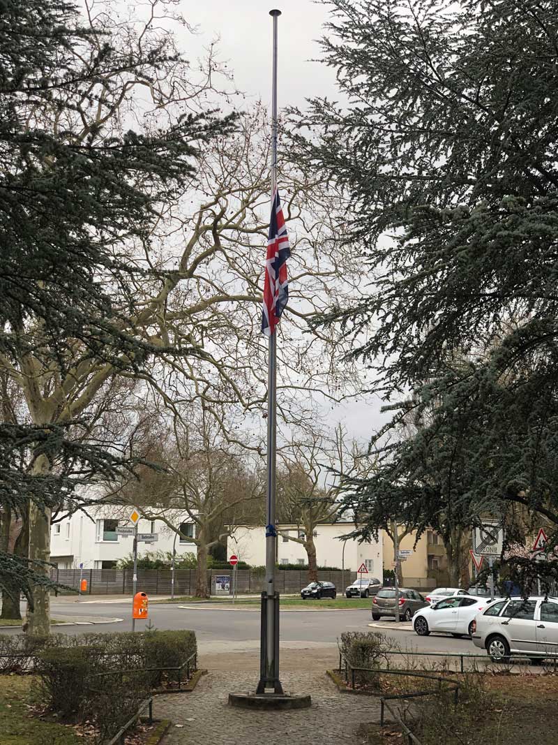 Once again, I find myself starting a newsletter with sad news. I have started three newsletters this year so far with sad news about great people passing who served with a great regiment (Queen’s Own Highlanders), those being Pipe Major Iain Morrison, Jimmy Macintosh and now HRH Prince Philip, the Duke of Edinburgh.I received this photo from Dietmar in Berlin, Germany showing the Union Jack at half-mast in front of St. George’s Anglican Church, former British Garrison Church of Berlin. We, the Queen’s Own Highlanders band, attended the Tattoo in Berlin, I think in 1988. Also, on the Berlin Tattoo that year were the Strathclyde and Lothian and Borders Police pipe bands. The Duke of Edinburgh was our Colonel-in-Chief and therefore we had a lot of associations with him. On a personal level, I had many occasions with him during my time as Pipe Major of the 1st Battalion, too many to relate here. However, just to mention a few, in last month’s newsletter I wrote about playing at the Gulf War Memorial Service in Glasgow Cathedral attended by Her Majesty, the Queen. The Duke of Edinburgh accompanied her and, as I slow marched down the centre of the cathedral and passed Her Majesty, he gave me a slight nod in recognition. He also wrote to me personally afterwards. I was wearing the Duke’s Pipe Banner – just as Pipe Major Peter Grant was when he played the same tune, Flowers of the Forest so splendidly at the Duke’s funeral on Saturday. The Pipe Banner has the Duke’s Royal Crest/Standard on one side and the Regimental Crest/Badge on the other side. Peter was also wearing the Pipe Major’s regimental buckles that have been handed down/on for many generations and worn by the Pipe Major of the 1st Battalion of the Regiment. These are the same buckles that I wore, as did Alasdair Gillies, Iain Morrison, Donald MacLeod, John MacLellan, D. R. MacLennan, Peter MacGregor and many more over the last 150 years or so. |