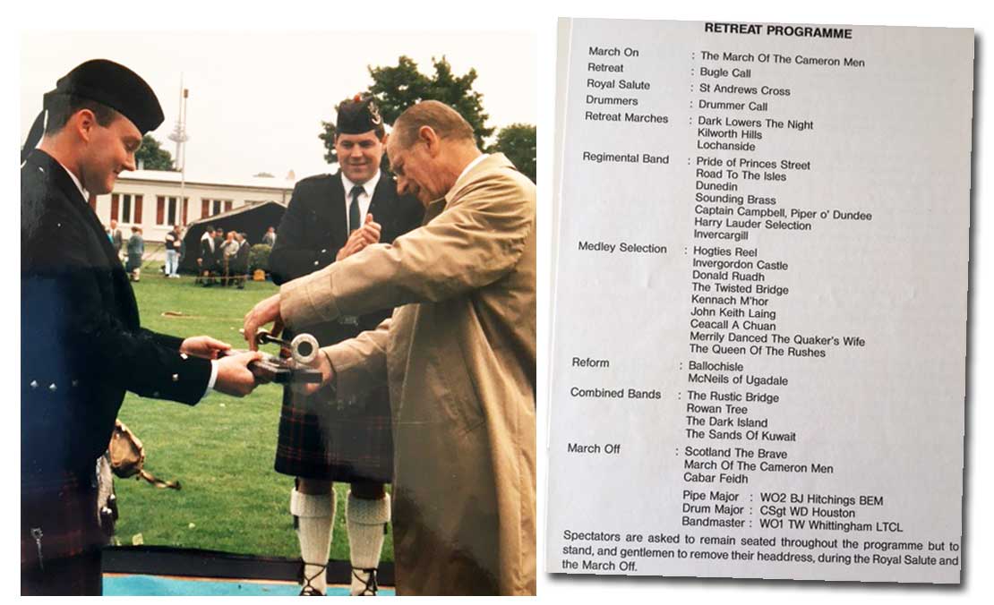 There is a strong superstition that you should only play the whole of Flowers of the Forest when playing at a tribute/salute and neither to play the whole tune when practicing and therefore should always leave a piece out. To play the whole tune through when practicing would bring bad luck and could mean you will be attending a funeral soon. I never play the tune without feeling respect. I also mentioned in my previous newsletter that we Trooped the Colour in Munster, Germany with His Royal Highness, Prince Phillip in attendance. He actually visited the regiment for three or four days and stayed with the Commanding Officer, now retired Maj. Gen. The Hon Seymour Monro CBE LVO and presently Chairman of the Northern Meeting Piping Trust plus Chairman of Forres Pipe Band. During the visit, a Beating of Retreat was held, the Retreat Programme is pictured below. There was also an Officer’s Mess Regimental Dinner Night held in his honour. We played with the traditional four pipers followed by myself playing the piobaireachd; I cannot remember which tune I played but it will be kept in the mess records. Pipe programmes are made and signed by the Pipe Major for every Regimental Dinner Night. On the Saturday there was a Highland Games and, of course, we ran a piping competition that was contested hotly yet still friendly. The Duke of Edinburgh presented all the prizes, see attached photo. Euan Stuart won a hand engraved full silver long practice chanter donated by David Naill Bagpipes (they have always been very supportive of military piping) Euan got to keep the chanter as Naills donated one for each competition. Euan went on to become Pipe Major of the King’s Own Scottish Borders and is now a Colonel in the Army Air Corp and is currently attached to the USA forces in Southern California. Also competed for was a Silver Star presented by the Royal Scottish Pipers' Society. |