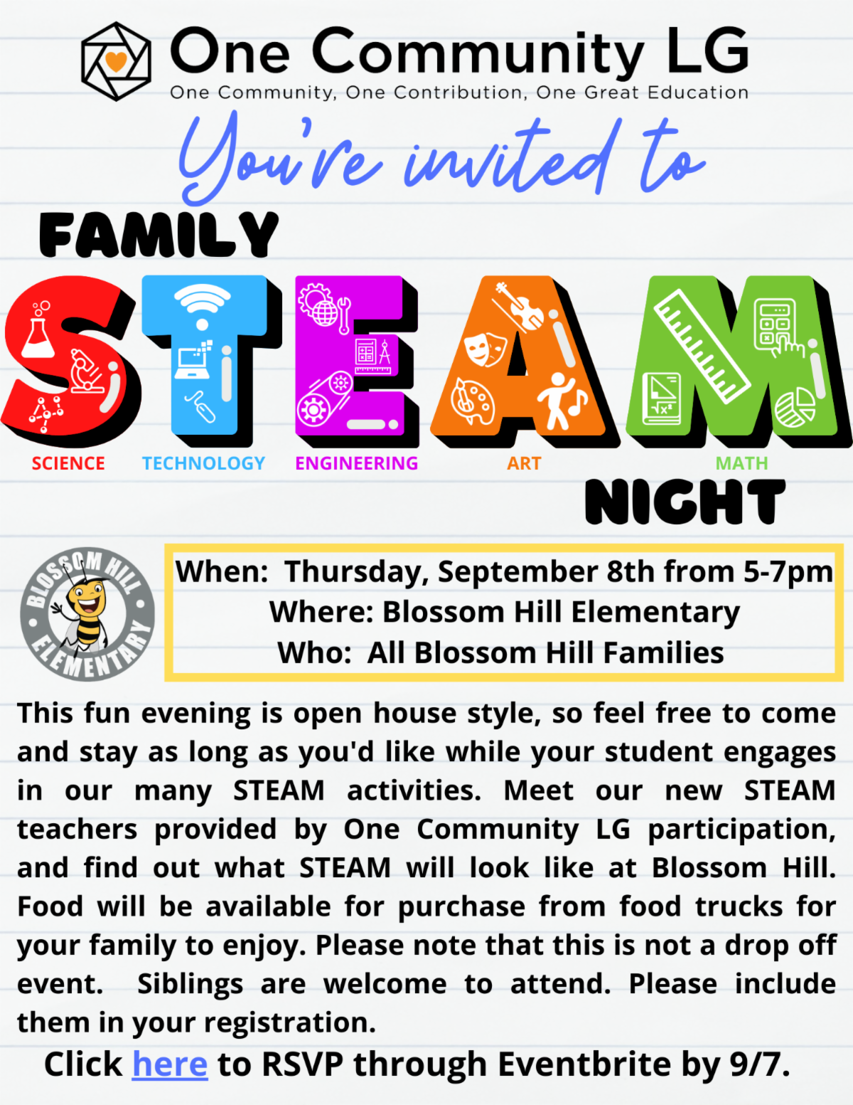 Thank you to everyone who joined us last Thursday for Back-to-School Night. It was a wonderful event bringing our learning community together and setting us up for a great year ahead. As was highlighted during the welcome, we will be hosting a Family STEAM Night on Thursday, September 8th from 5:00 to 7:00 pm. Please mark your calendars to ensure you can join us! Our three Teachers on Special Assignment (TOSAs) have been busy bees planning an evening full of fun and engaging thinking challenges where students and families will have opportunities to apply science, technology, engineering, art, and mathematics in contexts that make connections between school, community, and the world. We are fortunate to have the opportunity to work with these exemplary educators: Ramil Ochoa, Kristin Tylko and Michael Stock thanks to your generous support and donations to the One Community LG Campaign.