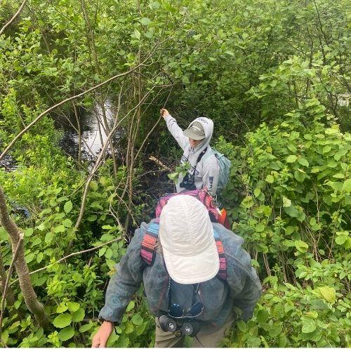 We spent the morning exploring, documenting plants and noting old hunting materials slated for removal, before arriving at our final stop: a long-abandoned log house in an open rocky clearing, surrounded by debris—from lawn chairs and piping to a rusted Volkswagen Beetle.