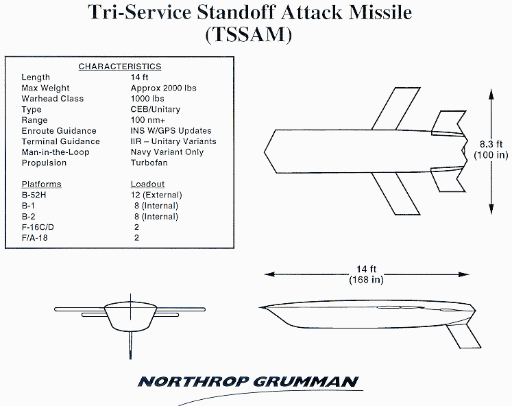 TSSAM Carriage and Separation WT Test Program: The AGM-137 Tri-Service Stand-Off Attack Missile (TSSAM) was a stealth cruise missile developed by Northrop Corporation at their facilities in Hawthorne, CA beginning in 1984. The large size of the air-launched variants of the TSSAM required that the wings and tail surfaces be stowed during carriage and launch, unfolding after the missile was clear of the carrier aircraft. Unfortunately, the TSSAM fuselage shape made the vehicle aerodynamically unstable with the wings and tails stowed. Northrop conducted initial store carriage and separations tests on the B-52 and F/A-18 during the initial full-scale development (IFSD) program prior to award of the full-scale development (FSD) contract in 1986. |