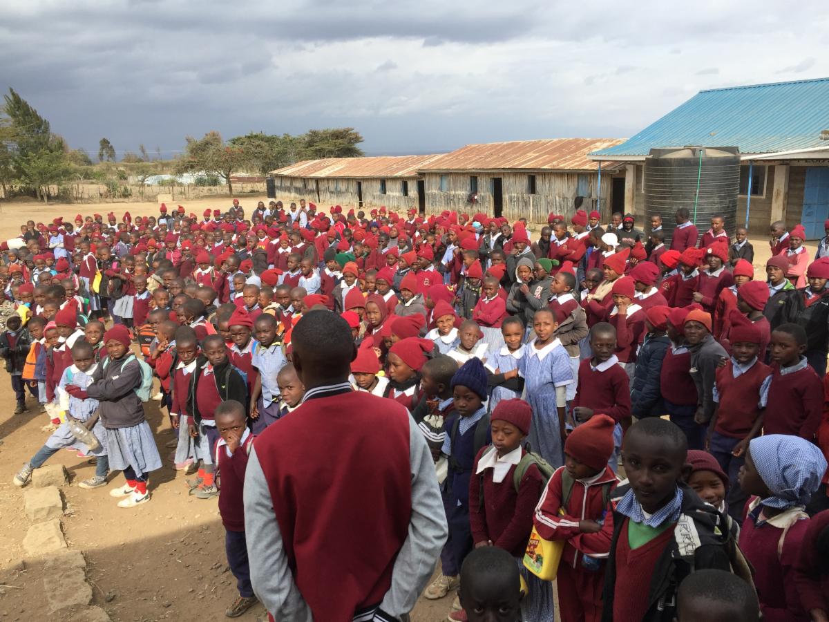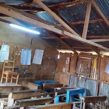 | | Mega-Project at a School in Kenya | | The Kiahuko School in Kenya is one of the most dire situations we’ve ever seen, and our entire business is dire situations. The school has 8 dirt-floored classrooms for the 487 students. This is the administration building: | | These are the students, assembled in the quad: | | But, there was no electricity. So, we just brought electricity into all of the classrooms. The difference is, well, night and day. (Can you imagine going to class in this room without the lights? It was a cave, as were all the other classrooms.) | | |