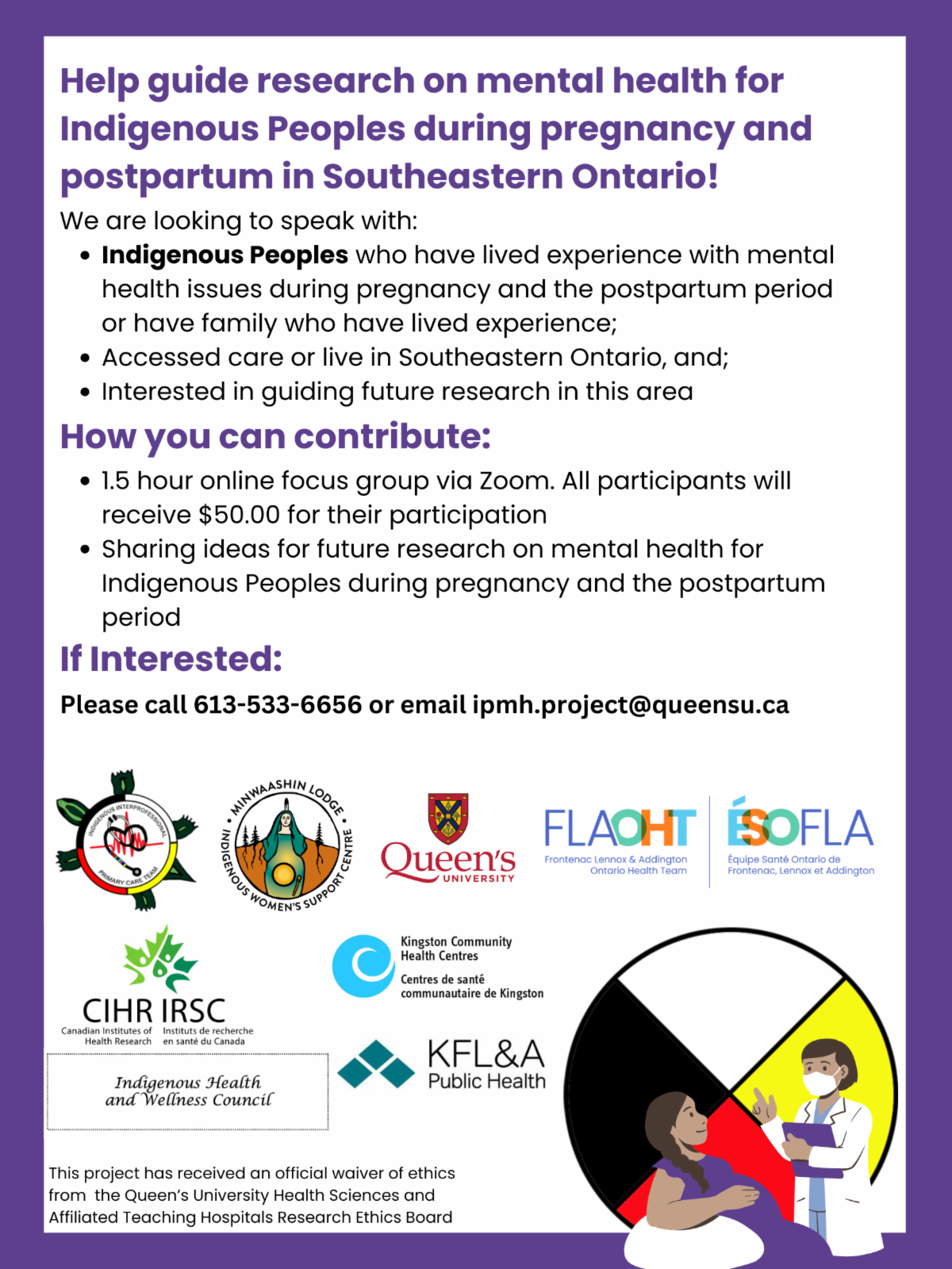 Are you Indigenous with lived experience of mental health challenges during pregnancy or postpartum? Or a care provider supporting Indigenous Peoples in Southeastern Ontario? You’re invited to join a 1.5-hour virtual focus group to help guide future research on perinatal mental health. Participants will receive a $50 honorarium for their time.