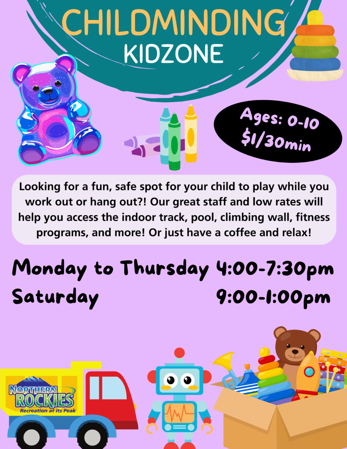 Looking for a fun, safe spot for your child to play while you work out or hang out?! Our great staff and low rates will help you access the indoor track, pool, climbing wall, fitness programs and more! Or just have a coffee and relax! Only $1/30mins!