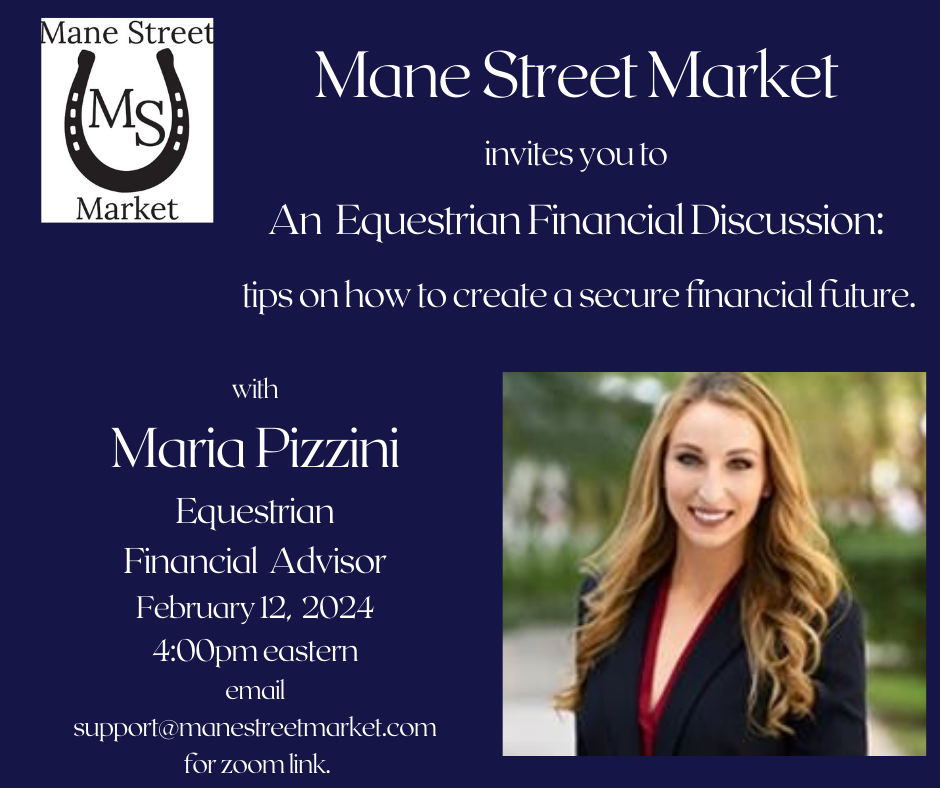 Join us for an educational discussion and Q&A about how to create a secure financial future in the equestrian world. Maria Pizzini is an industry leader as well as a lifetime equestrian so she truly understands the horse owner and the fact that most equestrians really don't want to talk about money!