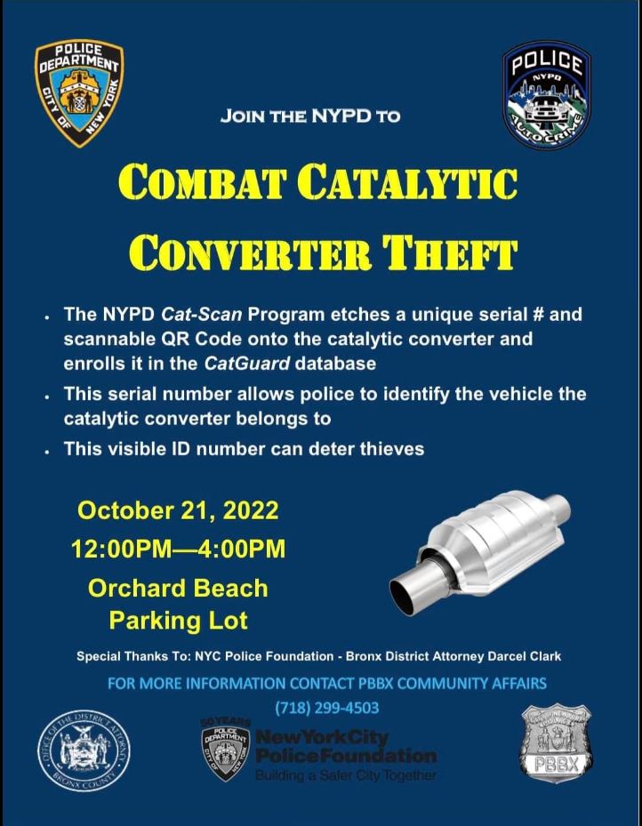 Stealing the catalytic converters from vehicles has become prevalent in the Bronx. To combat this crime, we are working with the NYPD to embed serial numbers on the converters to help deter thieves and the dishonest scrap metal shops who buy the stolen parts. We are holding an event this Friday, October 21, in the Orchard Beach parking lot. More event details below.