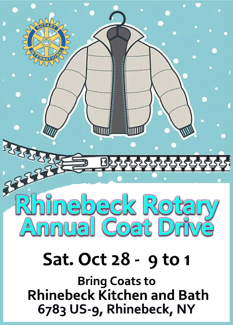 Rhinebeck Rotary Annual Coat Drive. Drop off your no longer needed clean coats in good condition. Coats will be shared with those in need in collaboration with Dutchess Outreach. At Rhinebeck Kitchen and Bath, 6783 Rte. 9, Rhinebeck.