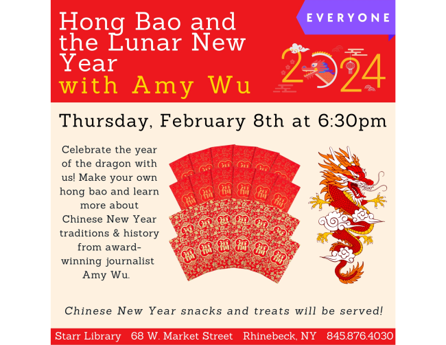 Hong Bao (“red envelope gifts” in Mandarin) and the Lunar New Year with Amy Wu. Make your own hong bao and learn more about Chinese New Year traditions; Chinese New Year snacks and treats will be served. Register at Starrlibrary.org. At the library, 68 West Market St., Rhinebeck.