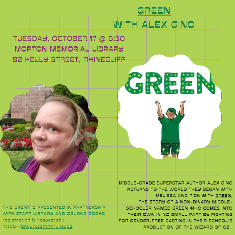 “Middle-grade superstar” author Alex Gino talks about their new book, “Green,” the story of a non-binary middle-schooler. Co-sponsored by Oblong Books, Morton Library, and Starr Library. Registration requested at https://tinyurl.com.mrynsydz. At Morton Library, 82 Kelly St., Rhinecliff.