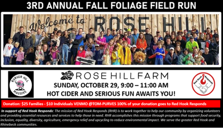 Fall Foliage Field Run to support Red Hook Responds. Organized by Burger Hill Massive running group. Donations $25 families, $10 individuals. At Rose Hill Farm, Red Hook.