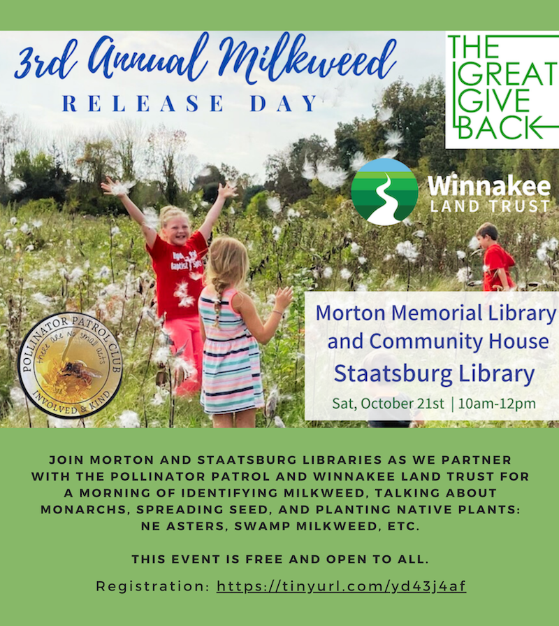 3rd Annual Milkweed Release Day, a morning of identifying milkweed, talking about monarchs, spreading seed, and planting native plants. Co-hosted by Morton Library, Staatsburg Library, the Pollinator Patrol and the Winnakee Land Trust. Register at https://tinyurl.com/yd43j4af. At Burger Hill, Rhinebeck.