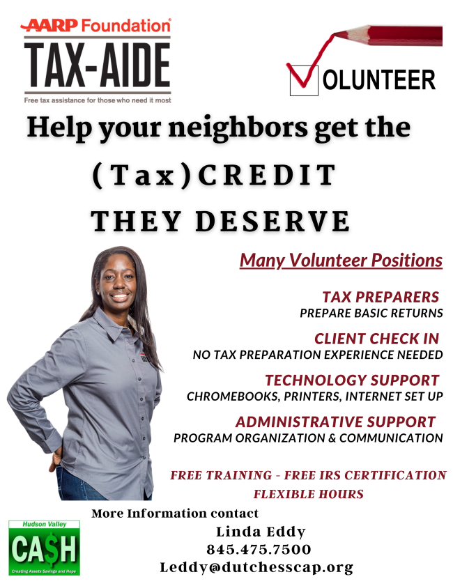 ”Help your neighbors get the (tax) credit they deserve” through the AARP Foundation Tax-Aide program. Many volunteer positions available, including tax preparers and technical and administrative support. FREE training. For details, call Linda Eddy at 845-475-7500.