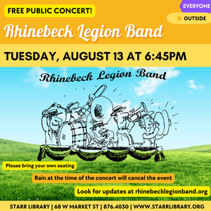 Rhinebeck Legion Band performs. Bring your own seating; concert canceled if it’s raining at the time of the concert. Registration requested. Outside at Starr Library, 68 West Market St., Rhinebeck.