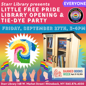 Little Free Pride Library Opening & Tie-Dye Party, celebrating the new LFL and Banned Books Week. Bring your own t-shirt. Register at starrlibrary.org. At the library, Rhinebeck.